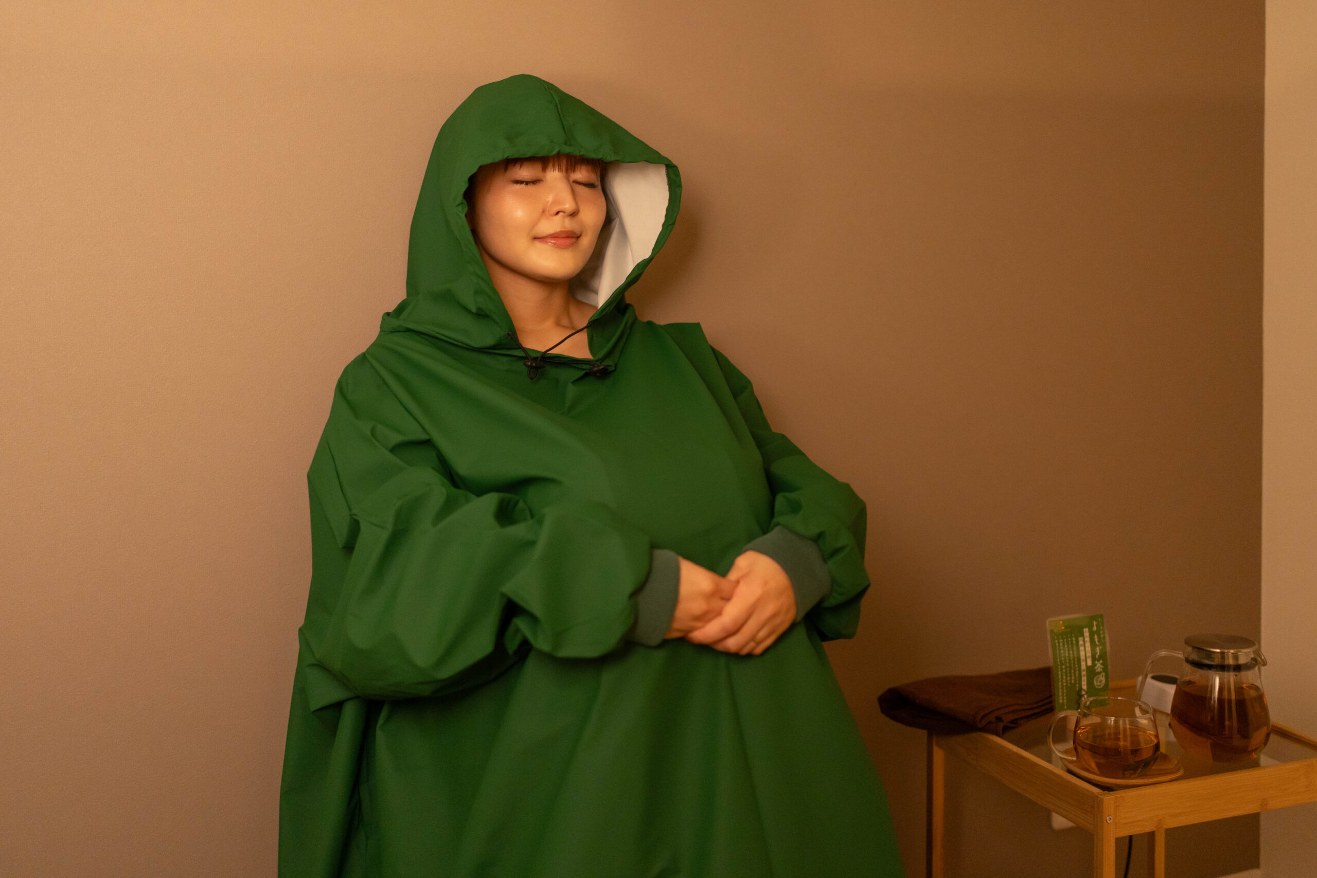 肌に触れる内側には、和紙100%、外側にはオーガニックコットンを採用。和紙はエコテックス認証の糸を使用し、農薬不使用の原料から織り上げています。さらりとした肌触りと優れた調湿性を備え、蒸気を浴びながらも快適な肌感を保ちます。ケミカルではなく自然由来の機能性が、心と身体をやさしく包み込む特別なマントです。