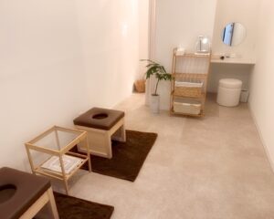 静岡の自然が育んだ富士ヒノキの無垢材で仕上げた、よもぎ蒸し専用の椅子。天然木ならではのぬくもりとほのかな香りに包まれ、長時間でも疲れにくい心地よい座り心地を実現しています。