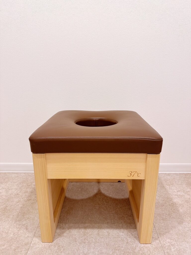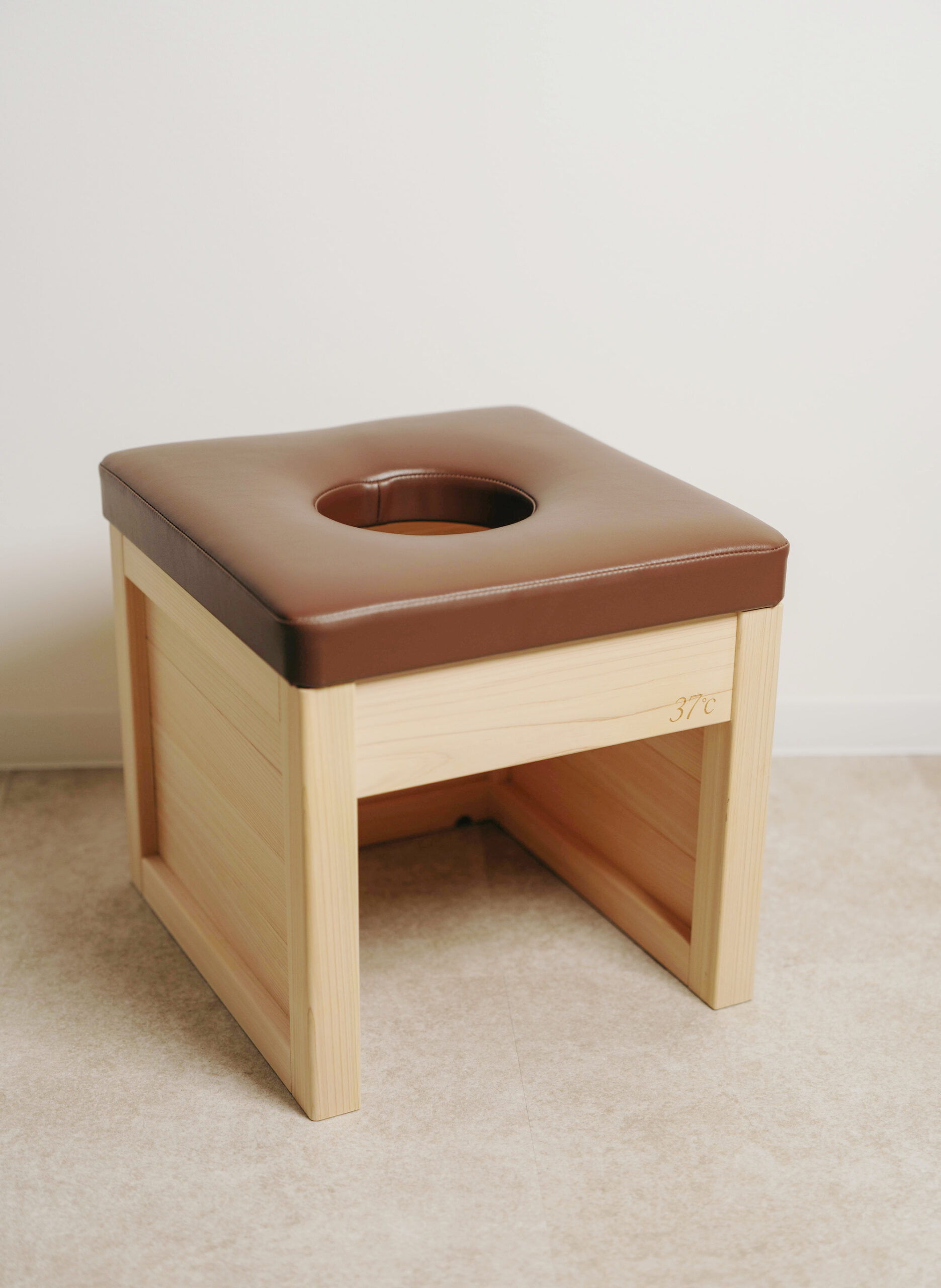 37℃のキセキで使用しているのは静岡の富士ヒノキの無垢材で仕上げたよもぎ蒸し専用の椅子です。